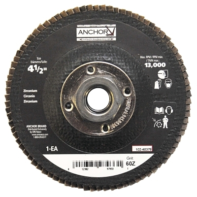 | Abrasive High Density Flap Discs, 4-1/2 in Dia, 60 Grit, 5/8 in - 11 Arbor, 12,000 rpm | |||