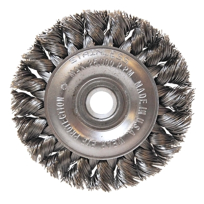 | Aggressive Cleaning Knot Wheel Brush, 3 in D x 3/8 in W, 0.014 in Carbon Steel, 1/2 in | |||