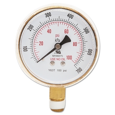 | Pressure Gauge, 2-1/2 in, 100 psi, Brass, 1/4 in NPT | |||